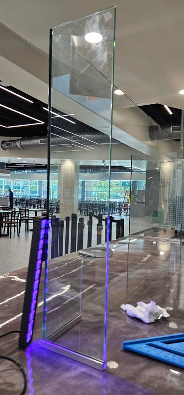 Our state-of-the-art UV lighting systems instantly activate the adhesive, bonding glass surfaces with precision. This process ensures ultra-clear finishes and long-lasting durability — without the need for frames or visible joints. Nuestros sistemas de luz ultravioleta activan el adhesivo al instante, uniendo superficies de vidrio con máxima precisión. El resultado: acabados invisibles, resisten